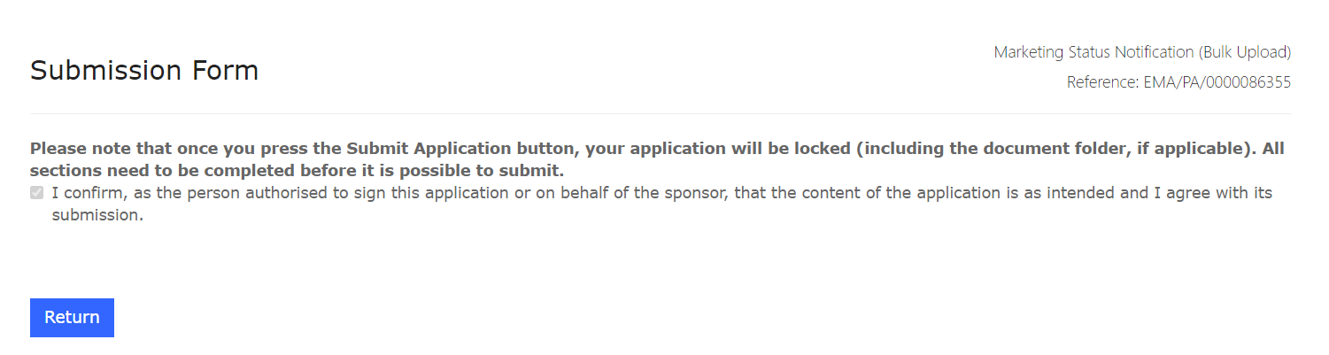 For a couple of our bulk submissions we have received a validation error message due to some corrections that were needed in the uploaded excel. However, if going to the ongoing submission item I can only re-upload the new excel and then "Save & Return". The subsequent "Declaration" and "Submission Form" steps are already filled in and inactive and hence I cannot re-submit this item for activating a new validation cycle. I have attached a print screen of the Submission Form tab.