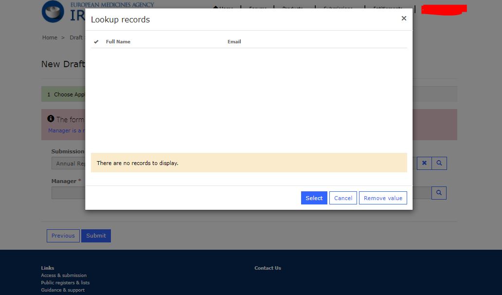 Hi there, I am trying to create an orphan annual report submission. I've selected annual report, but the manager is not appearing to be selected. Is this an issue in relation to SPOR ?